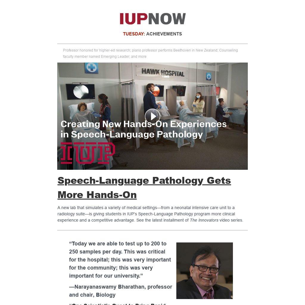 Distributed to IUP employees and students three days a week on its summer schedule, IUP Now is the official newsletter of Indiana University of Pennsylvania. It features news from across the IUP website, compiled by the Division of Marketing and Communications. Find out how to get your news and events in IUP Now.