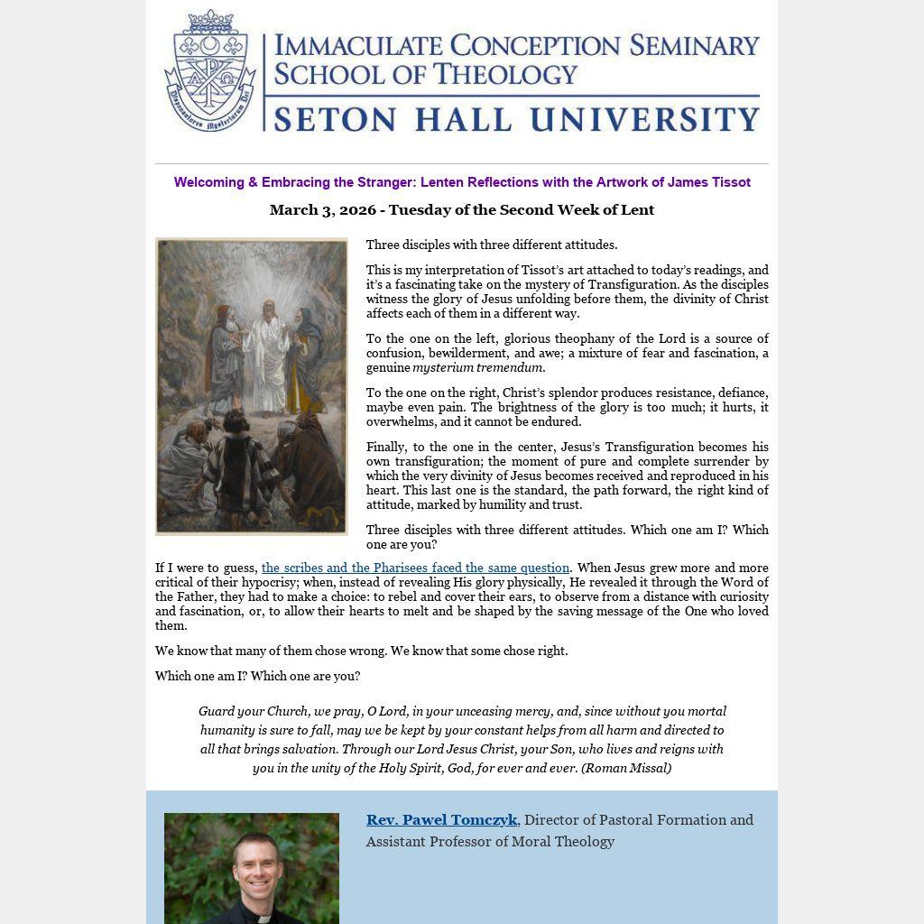 This is my interpretation of Tissot’s art attached to today’s readings, and it’s a fascinating take on the mystery of Transfiguration. As the disciples witness the glory of Jesus unfolding before them, the divinity of Christ affects each of them in a different way.