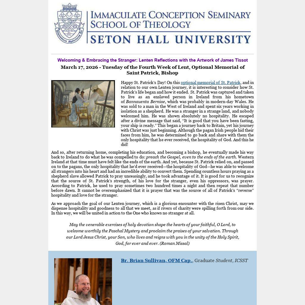 Happy St. Patrick’s Day! On this optional memorial of St. Patrick, and in relation to our own Lenten journey, it is interesting to consider how St. Patrick’s life began and how it ended. St. Patrick was captured and taken to live as an enslaved person in Ireland from his hometown of Bannauenta Berniae, which was probably in modern-day Wales. He was sold to a man in the West of Ireland and spent six years working in isolation as a shepherd. He was a stranger in a strange land, and nobody welcomed him. He was shown absolutely no hospitality. He escaped after a divine message that said, “It is good that you have been fasting, your ship is ready.” This began a journey back to Britain, yet his journey with Christ was just beginning. Although the pagan Irish people hid their faces from him, he was determined to go back and share with them the only hospitality that he ever received, the hospitality of God. And this he did!