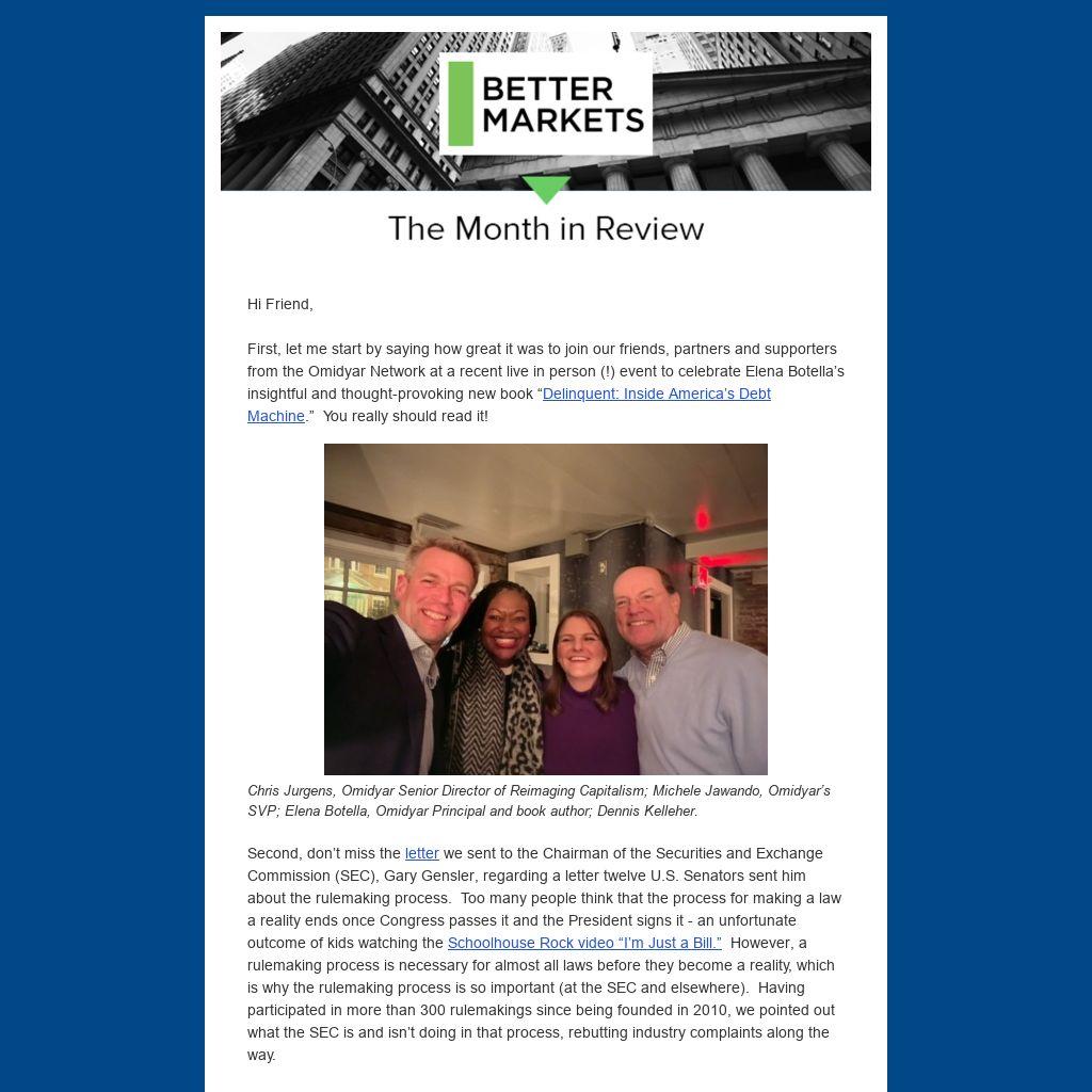 | Second, don’t miss the letter we sent to the Chairman of the Securities and Exchange Commission (SEC), Gary Gensler, regarding a letter twelve U.S. Senators sent him about the rulemaking process. Too many people think that the process for making a law a reality ends once Congress passes it and the President signs it - an unfortunate outcome of kids watching the Schoolhouse Rock video “I’m Just a Bill.” However, a rulemaking process is necessary for almost all laws before they become a reality, which is why the rulemaking process is so important (at the SEC and elsewhere). Having participated in more than 300 rulemakings since being founded in 2010, we pointed out what the SEC is and isn’t doing in that process, rebutting industry complaints along the way.