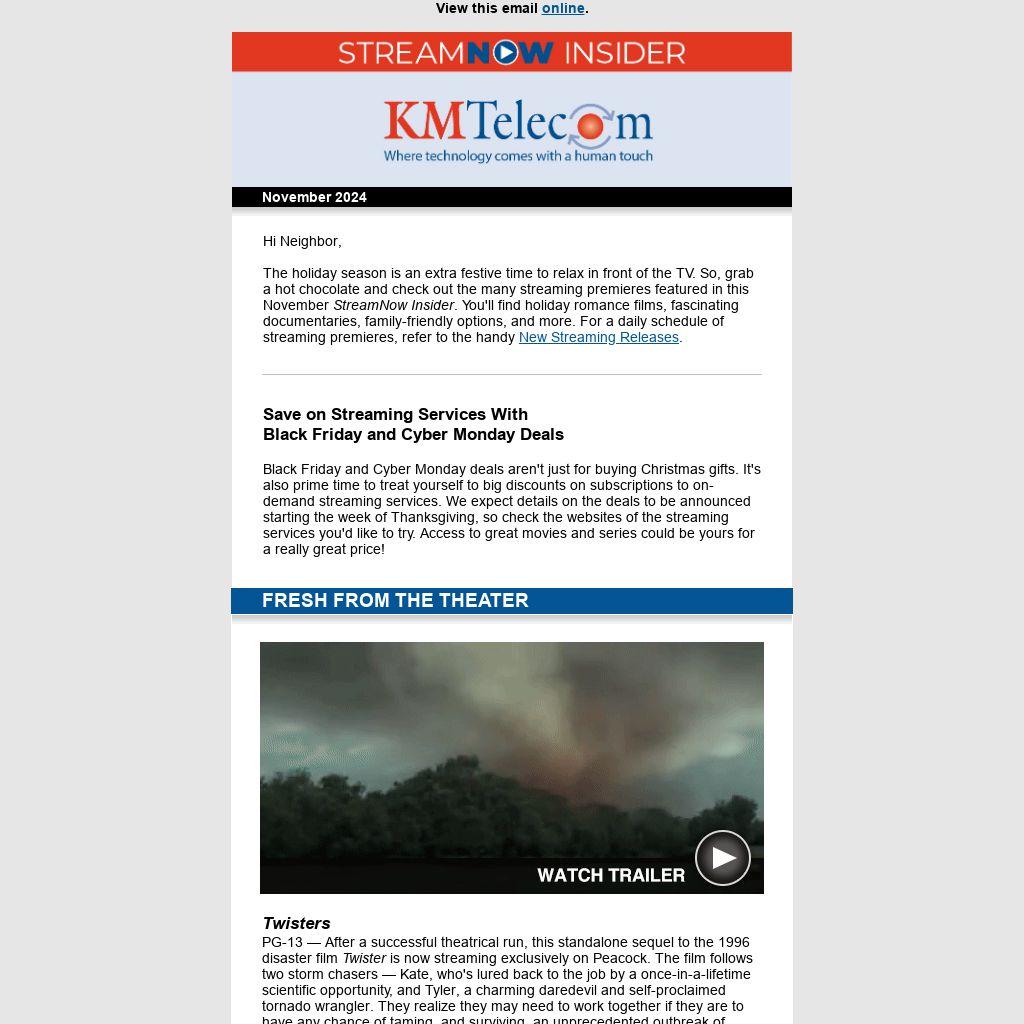 The holiday season is an extra festive time to relax in front of the TV. So, grab a hot chocolate and check out the many streaming premieres featured in this November StreamNow Insider. You'll find holiday romance films, fascinating documentaries, family-friendly options, and more. For a daily schedule of streaming premieres, refer to the handy New Streaming Releases. ![]() Black Friday and Cyber Monday Deals Black Friday and Cyber Monday deals aren't just for buying Christmas gifts. It's also prime time to treat yourself to big discounts on subscriptions to on-demand streaming services. We expect details on the deals to be announced starting the week of Thanksgiving, so check the websites of the streaming services you'd like to try. Access to great movies and series could be yours for a really great price! |