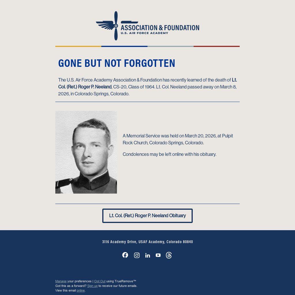 The U.S. Air Force Academy Association & Foundation has recently learned of the death of Lt. Col. (Ret.) Roger P. Neeland, CS-20, Class of 1964. Lt. Col. Neeland passed away on March 8, 2026, in Colorado Springs, Colorado.