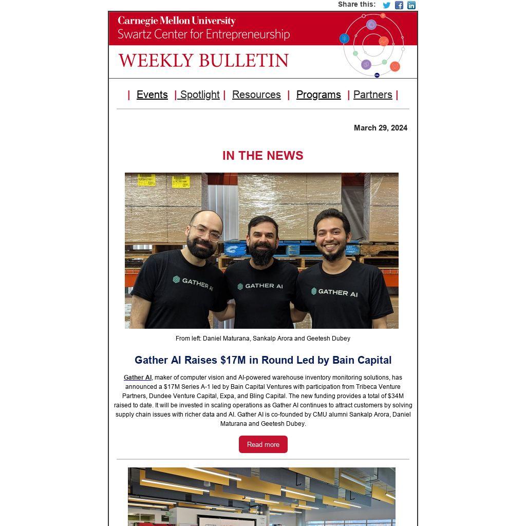 Have startup news or opportunities to share? Have questions about the Swartz Center Weekly Bulletin? Send news, opportunities or questions to Sonya Ford, Program Manager.