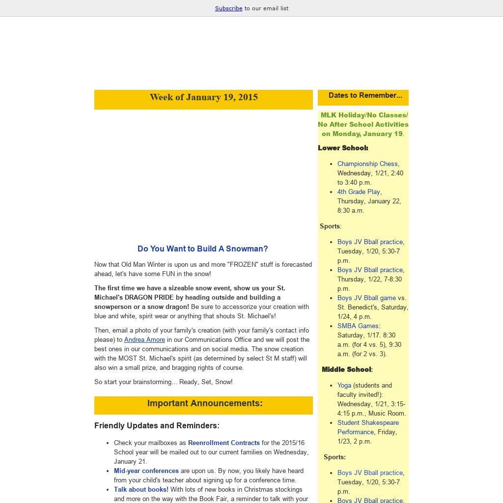 Now that Old Man Winter is upon us and more "FROZEN" stuff is forecasted ahead, let's have some FUN in the snow! The first time we have a sizeable snow event, show us your St. Michael's DRAGON PRIDE by heading outside and building a snowperson or a snow dragon! Be sure to accessorize your creation with blue and white, spirit wear or anything that shouts St. Michael's! Then, email a photo of your family's creation (with your family's contact info please) to Andrea Amore in our Communications Office and we will post the best ones in our communications and on social media. The snow creation with the MOST St. Michael's spirit (as determined by select St M staff) will also win a small prize, and bragging rights of course. So start your brainstorming... Ready, Set, Snow!