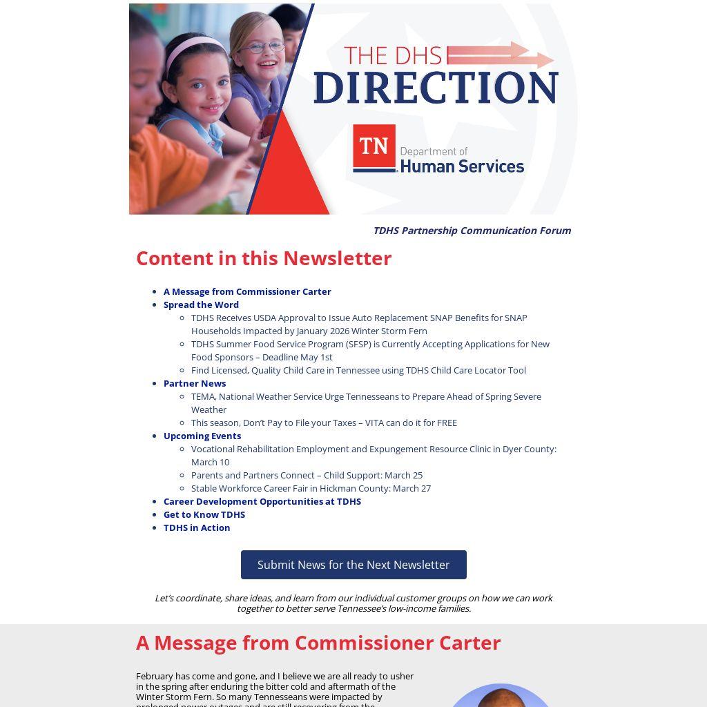 February has come and gone, and I believe we are all ready to usher in the spring after enduring the bitter cold and aftermath of the Winter Storm Fern. So many Tennesseans were impacted by prolonged power outages and are still recovering from the devastation left behind. Yet, even in the most challenging moments, I was deeply encouraged by the way our neighbors, community partners, and TDHS staff came together to deploy resources, offer support, and ensure customers maintained access to essential services.