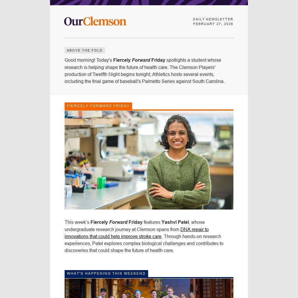 Good morning! Today's Fiercely Forward Friday spotlights a student whose research is helping shape the future of health care. The Clemson Players' production of Twelfth Night begins tonight; Athletics hosts several events, including the final game of baseball's Palmetto Series against South Carolina.