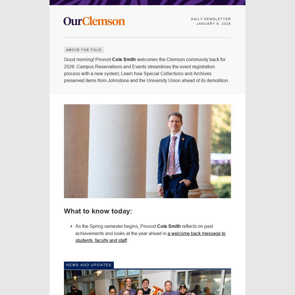 Good morning! Provost Cole Smith welcomes the Clemson community back for 2026. Campus Reservations and Events streamlines the event registration process with a new system; Learn how Special Collections and Archives preserved items from Johnstone and the University Union ahead of its demolition.