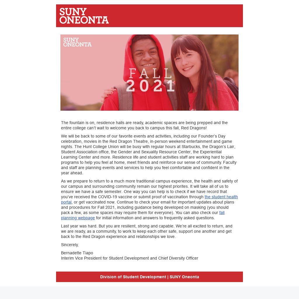 As we prepare to return to a much more traditional campus experience, the health and safety of our campus and surrounding community remain our highest priorites. It will take all of us to ensure we have a safe semester. One way you can help is to check if we have record that you’ve received the COVID-19 vaccine or submit proof of vaccination through the student health portal, or get vaccinated now. Continue to check your email for important updates about plans and procedures for Fall 2021, including guidance being developed on masking (you should pack a few, as some spaces may require them for everyone). You can also check our fall planning webpage for initial information and answers to frequently asked questions.