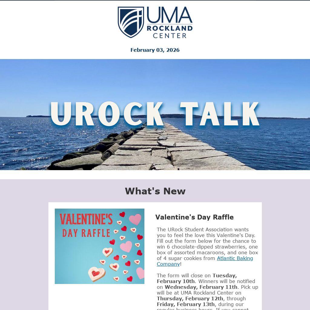 The URock Student Association wants you to feel the love this Valentine's Day. Fill out the form below for the chance to win 6 chocolate-dipped strawberries, one box of assorted macaroons, and one box of 4 sugar cookies from Atlantic Baking Company!