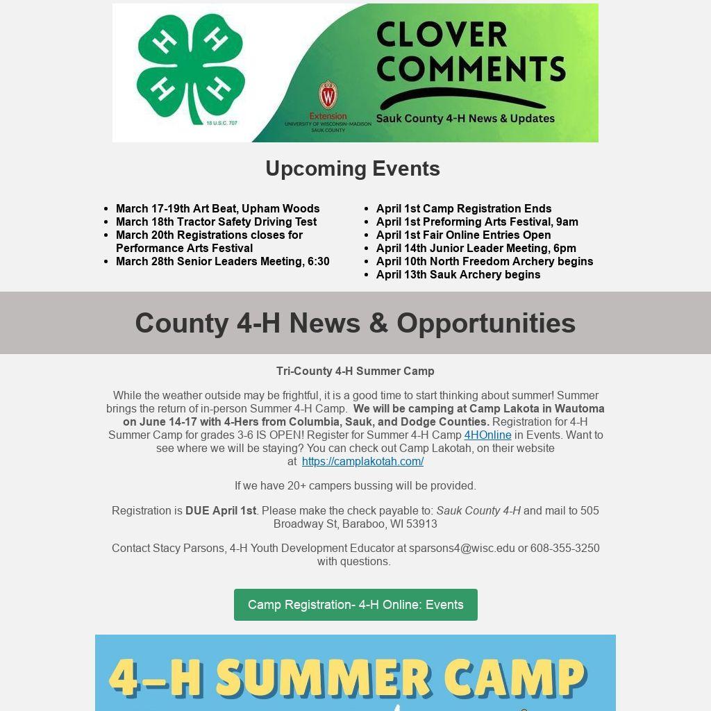 Contact Stacy Parsons, 4-H Youth Development Educator at sparsons4@wisc.edu or 608-355-3250 with questions.