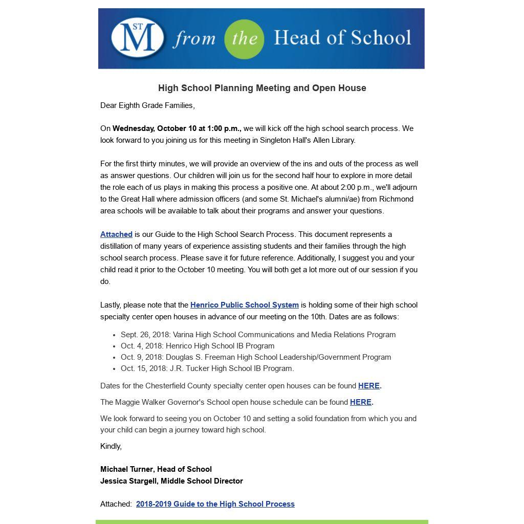 Attached is our Guide to the High School Search Process. This document represents a distillation of many years of experience assisting students and their families through the high school search process. Please save it for future reference. Additionally, I suggest you and your child read it prior to the October 10 meeting. You will both get a lot more out of our session if you do.