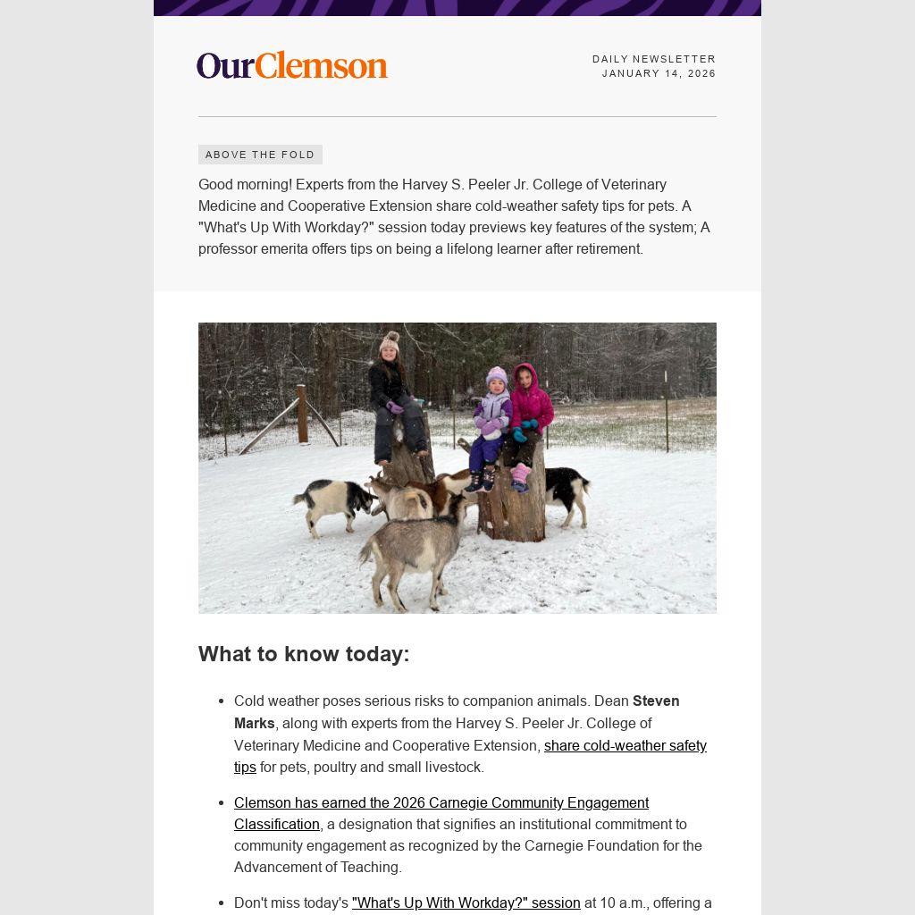 Good morning! Experts from the Harvey S. Peeler Jr. College of Veterinary Medicine and Cooperative Extension share cold-weather safety tips for pets. A "What's Up With Workday?" session today previews key features of the system; A professor emerita offers tips on being a lifelong learner after retirement.