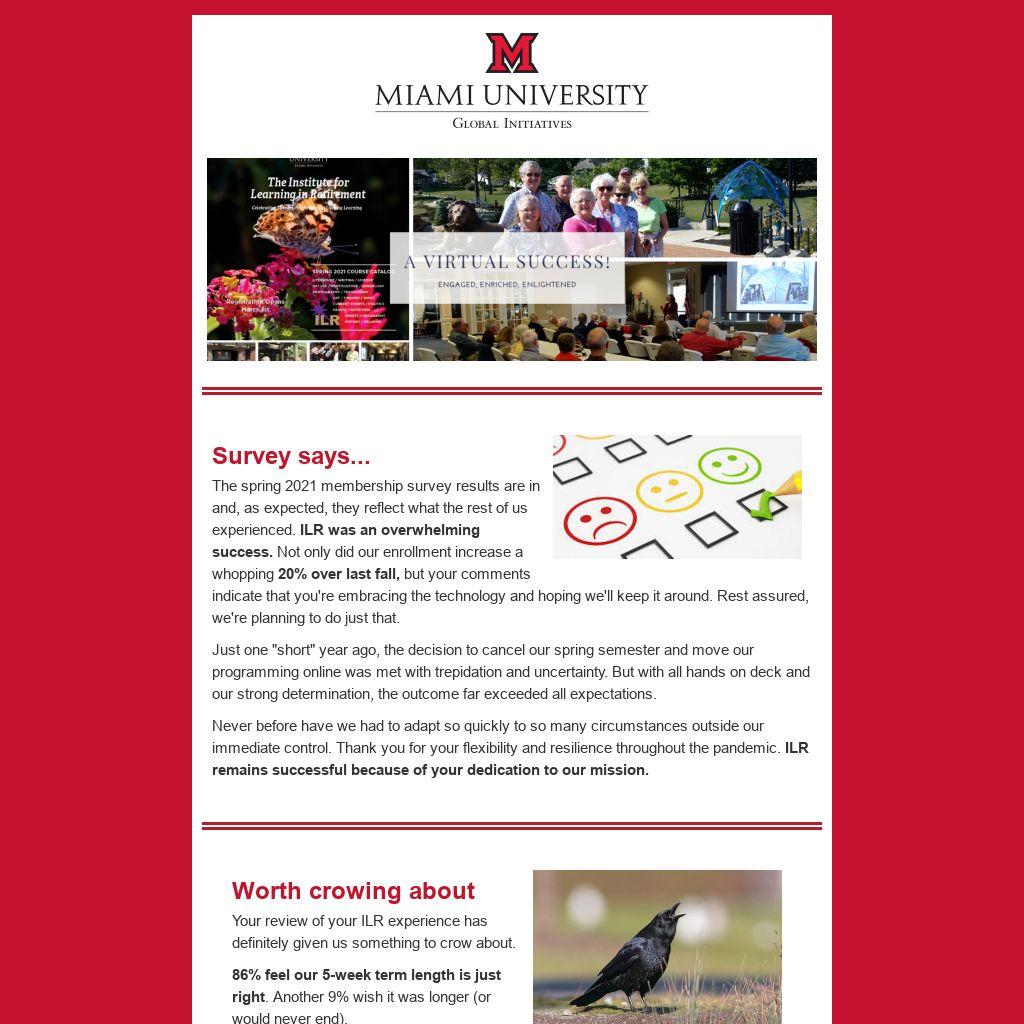 Survey says...The spring 2021 membership survey results are in and, as expected, they reflect what the rest of us experienced. ILR was an overwhelming success. Not only did our enrollment increase a whopping 20% over last fall, but your comments indicate that you're embracing the technology and hoping we'll keep it around. Rest assured, we're planning to do just that.