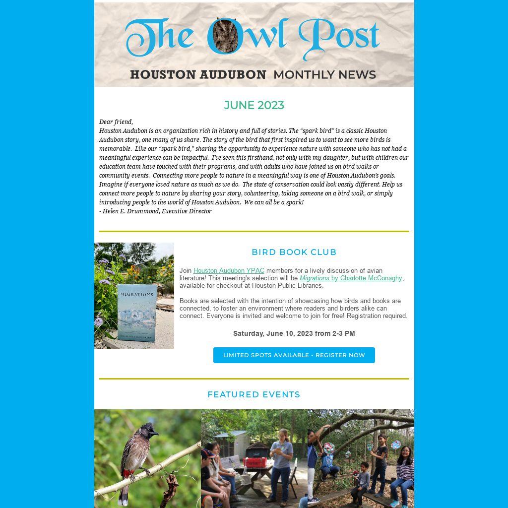 Join Houston Audubon YPAC members for a lively discussion of avian literature! This meeting's selection will be Migrations by Charlotte McConaghy, available for checkout at Houston Public Libraries.Â