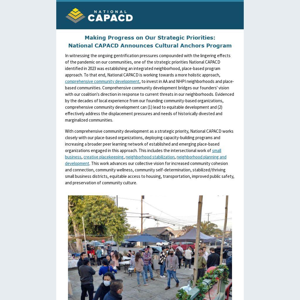 In witnessing the ongoing gentrification pressures compounded with the lingering effects of the pandemic on our communities, one of the strategic priorities National CAPACD identified in 2023 was establishing an integrated neighborhood, place-based program approach. To that end, National CAPACD is working towards a more holistic approach, comprehensive community development, to invest in AA and NHPI neighborhoods and place-based communities. Comprehensive community development bridges our founders' vision with our coalition's direction in response to current threats in our neighborhoods. Evidenced by the decades of local experience from our founding community-based organizations, comprehensive community development can (1) lead to equitable development and (2) effectively address the displacement pressures and needs of historically divested and marginalized communities.
