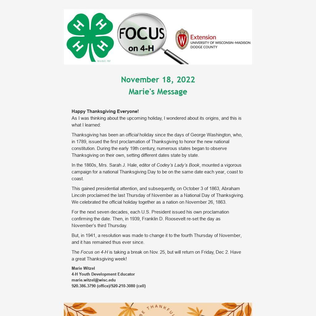The Focus on 4-H is taking a break on Nov. 25, but will return on Friday, Dec 2. Have a great Thanksgiving week!