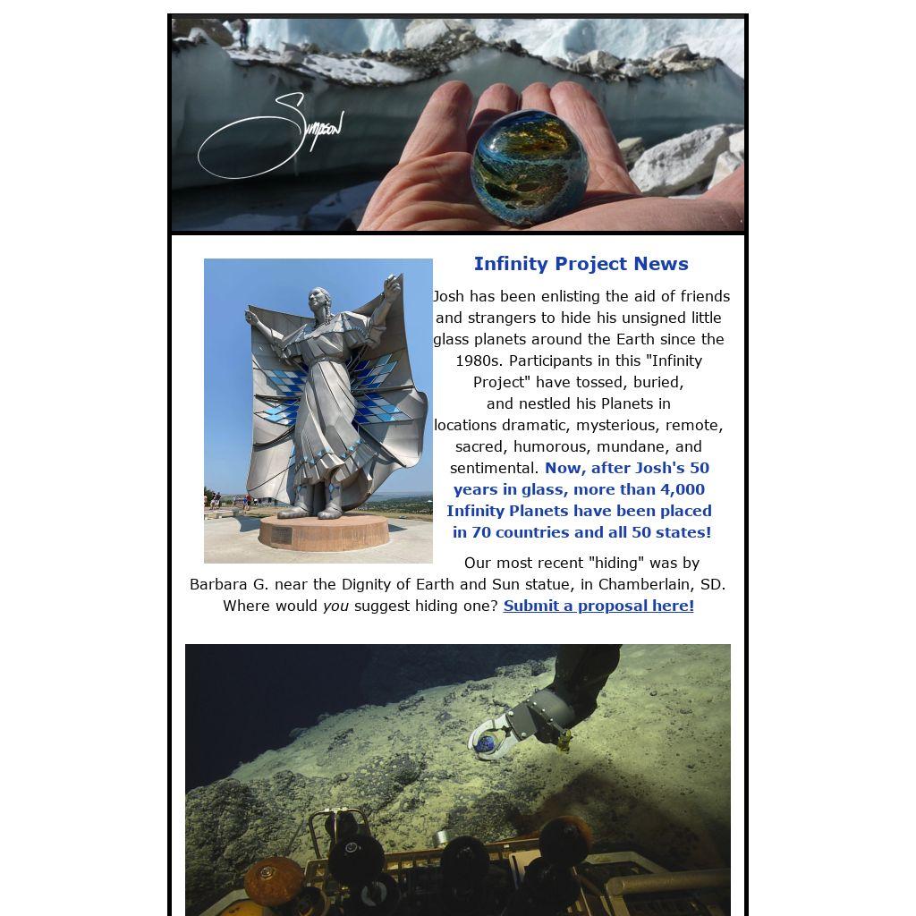 Josh has been enlisting the aid of friends and strangers to hide his unsigned little glass planets around the Earth since the 1980s. Participants in this "Infinity Project" have tossed, buried, and nestled his Planets in locations dramatic, mysterious, remote, sacred, humorous, mundane, and sentimental. Now, after Josh's 50 years in glass, more than 4,000 Infinity Planets have been placed in 70 countries and all 50 states!