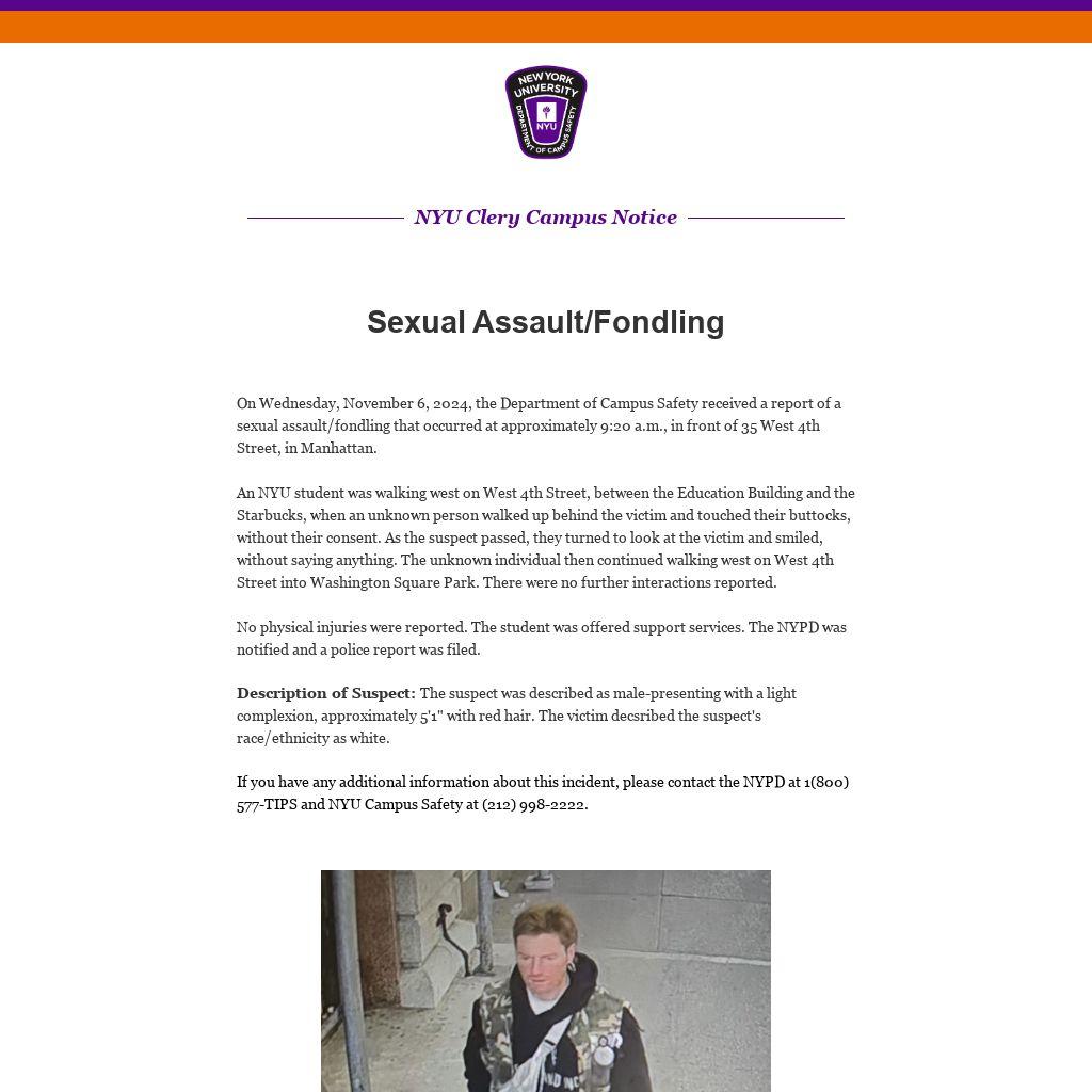 On Wednesday, November 6, 2024, the Department of Campus Safety received a report of a sexual assault/fondling that occurred at approximately 9:20 a.m., in front of 35 West 4th Street, in Manhattan.