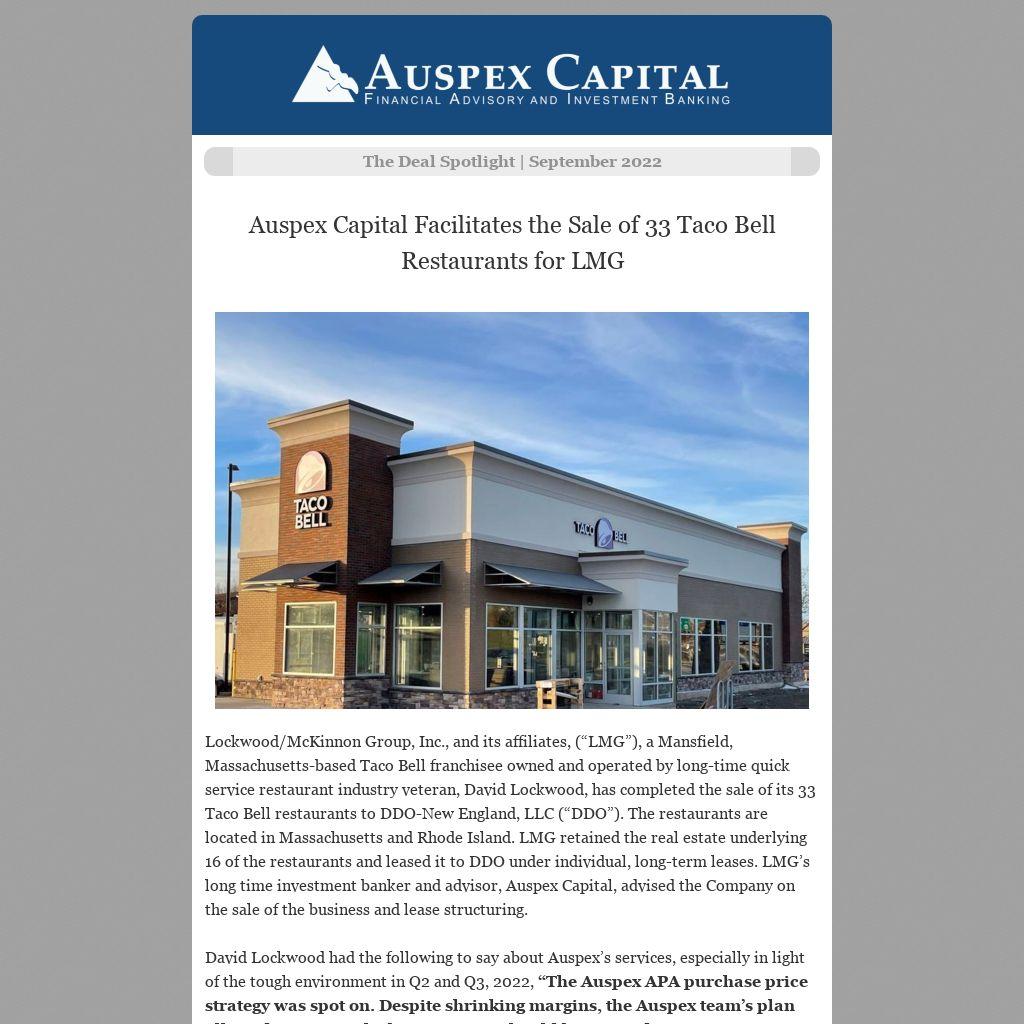 Lockwood/McKinnon Group, Inc., and its affiliates, (“LMG”), a Mansfield, Massachusetts-based Taco Bell franchisee owned and operated by long-time quick service restaurant industry veteran, David Lockwood, has completed the sale of its 33 Taco Bell restaurants to DDO-New England, LLC (“DDO”). The restaurants are located in Massachusetts and Rhode Island. LMG retained the real estate underlying 16 of the restaurants and leased it to DDO under individual, long-term leases. LMG’s long time investment banker and advisor, Auspex Capital, advised the Company on the sale of the business and lease structuring.