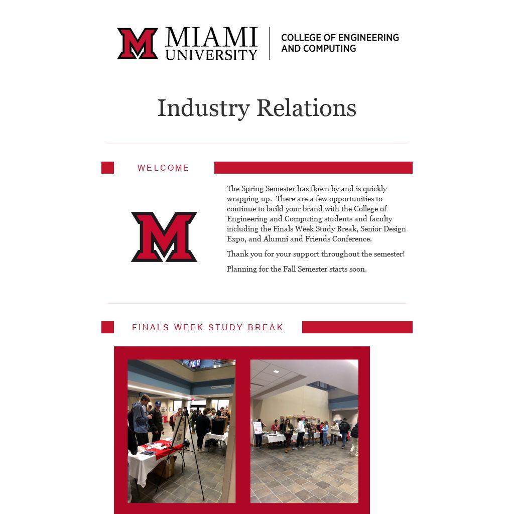 The Spring Semester has flown by and is quickly wrapping up. There are a few opportunities to continue to build your brand with the College of Engineering and Computing students and faculty including the Finals Week Study Break, Senior Design Expo, and Alumni and Friends Conference.