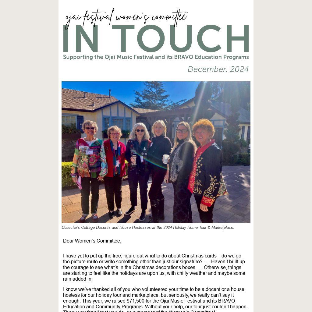 I know we’ve thanked all of you who volunteered your time to be a docent or a house hostess for our holiday tour and marketplace, but seriously, we really can’t say it enough. This year, we raised $71,500 for the Ojai Music Festival and its BRAVO Education and Community Programs. Without your help, our tour just couldn’t happen. Thank you for all that you do, as a member of the Women’s Committee!