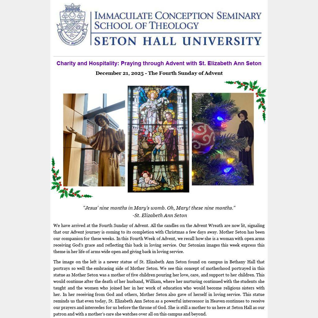 Mary, Joseph, and St. Elizabeth Ann Seton direct us in these final days of Advent to have our arms stretched out wide to receive the love and grace of Our God. We in return pay it forward in loving service to our neighbor.
