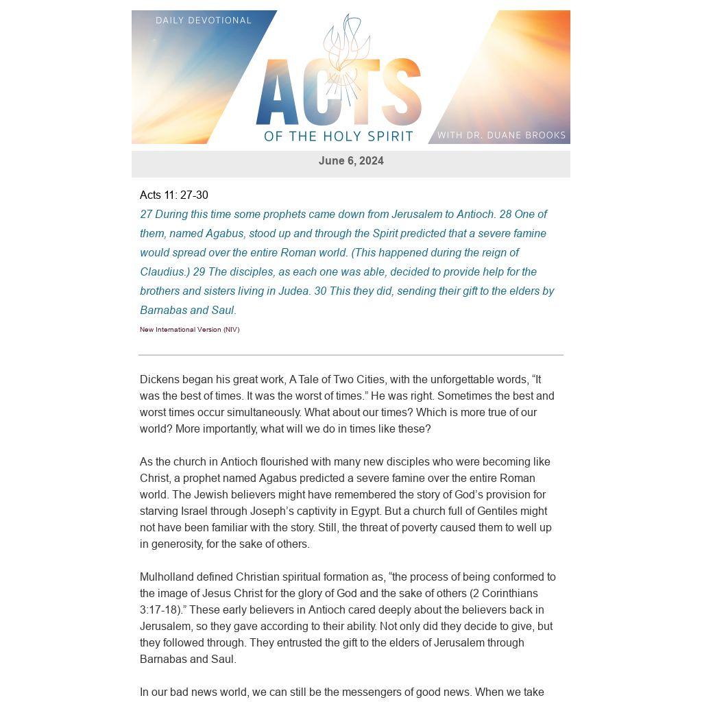 As the church in Antioch flourished with many new disciples who were becoming like Christ, a prophet named Agabus predicted a severe famine over the entire Roman world. The Jewish believers might have remembered the story of God’s provision for starving Israel through Joseph’s captivity in Egypt. But a church full of Gentiles might not have been familiar with the story. Still, the threat of poverty caused them to well up in generosity, for the sake of others.
