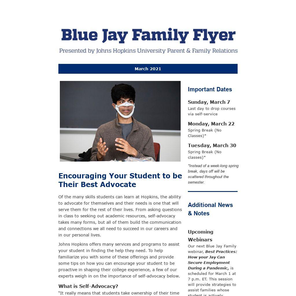 Our next Blue Jay Family webinar, Best Practices: How your Jay Can Secure Employment During a Pandemic, is scheduled for March 1 at 7 p.m. ET. This session will provide strategies to assist families whose student is actively seeking employment or an internship during the pandemic. Please click here to register.