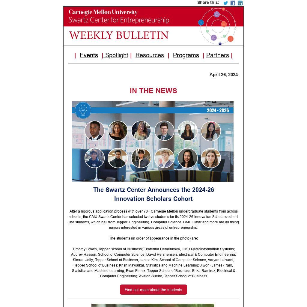 Have startup news or opportunities to share? Have questions about the Swartz Center Weekly Bulletin? Send news, opportunities or questions to Sonya Ford, Program Manager.