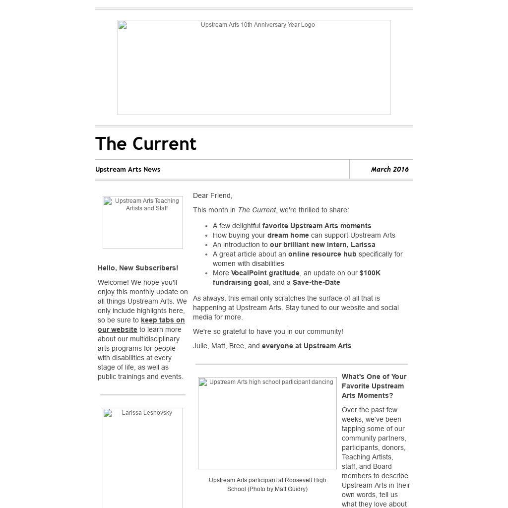 | Dear Friend, This month in The Current, we're thrilled to share:- A few delightful favorite Upstream Arts moments