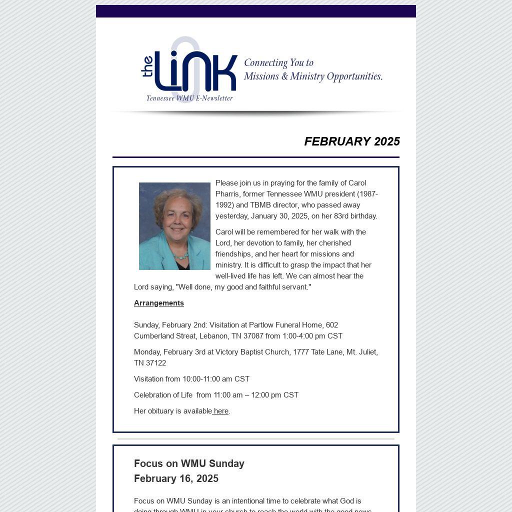 Please join us in praying for the family of Carol Pharris, former Tennessee WMU president (1987-1992) and TBMB director, who passed away yesterday, January 30, 2025, on her 83rd birthday.