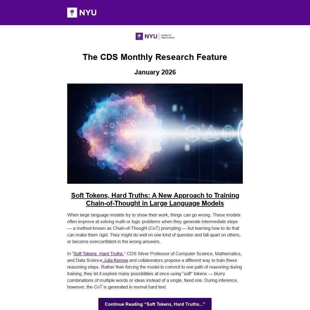 In “Soft Tokens, Hard Truths,” CDS Silver Professor of Computer Science, Mathematics, and Data Science Julia Kempe and collaborators propose a different way to train these reasoning steps. Rather than forcing the model to commit to one path of reasoning during training, they let it explore many possibilities at once using “soft” tokens — blurry combinations of multiple words or ideas instead of a single, fixed one. During inference, however, the CoT is generated in normal hard text.