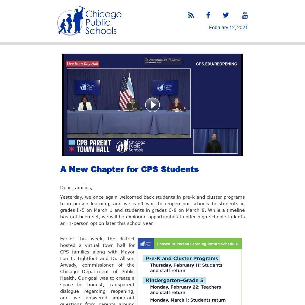 Yesterday, we once again welcomed back students in pre-k and cluster programs to in-person learning, and we can’t wait to reopen our schools to students in grades k-5 on March 1 and students in grades 6-8 on March 8. While a timeline has not been set, we will be exploring opportunities to offer high school students an in-person option later this school year.