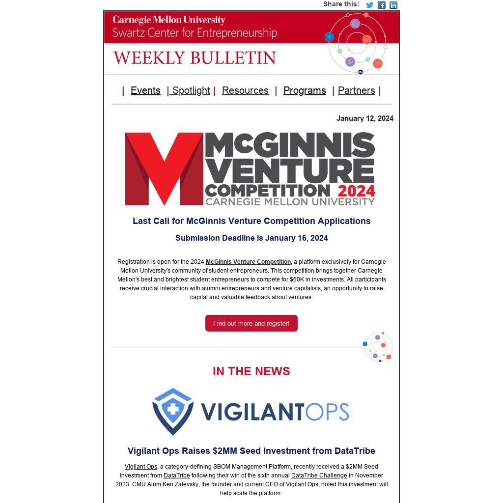 Submission Deadline is January 16, 2024 Registration is open for the 2024 McGinnis Venture Competition, a platform exclusively for Carnegie Mellon University's community of student entrepreneurs. This competition brings together Carnegie Mellon's best and brightest student entrepreneurs to compete for $60K in investments. All participants receive crucial interaction with alumni entrepreneurs and venture capitalists, an opportunity to raise capital and valuable feedback about ventures.