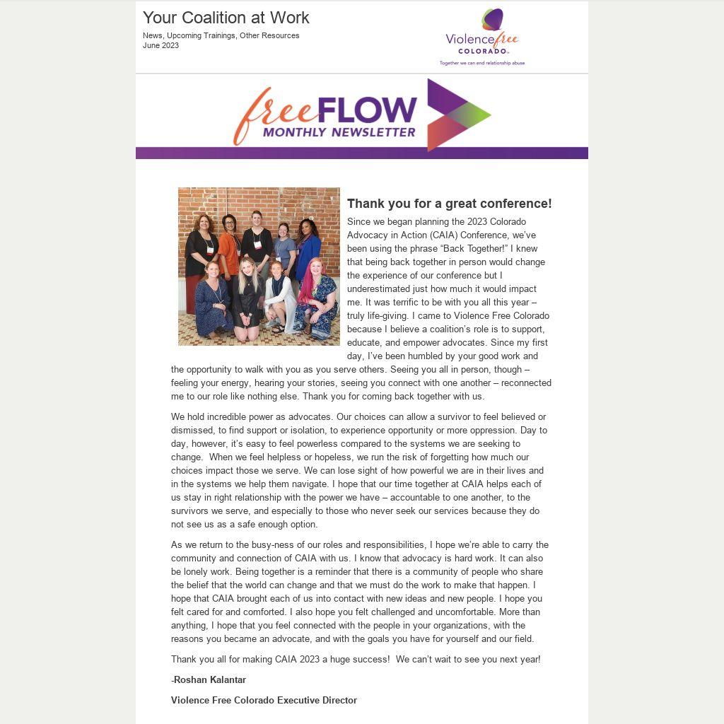 Since we began planning the 2023 Colorado Advocacy in Action (CAIA) Conference, we’ve been using the phrase “Back Together!” I knew that being back together in person would change the experience of our conference but I underestimated just how much it would impact me. It was terrific to be with you all this year – truly life-giving. I came to Violence Free Colorado because I believe a coalition’s role is to support, educate, and empower advocates. Since my first day, I’ve been humbled by your good work and the opportunity to walk with you as you serve others. Seeing you all in person, though – feeling your energy, hearing your stories, seeing you connect with one another – reconnected me to our role like nothing else. Thank you for coming back together with us.