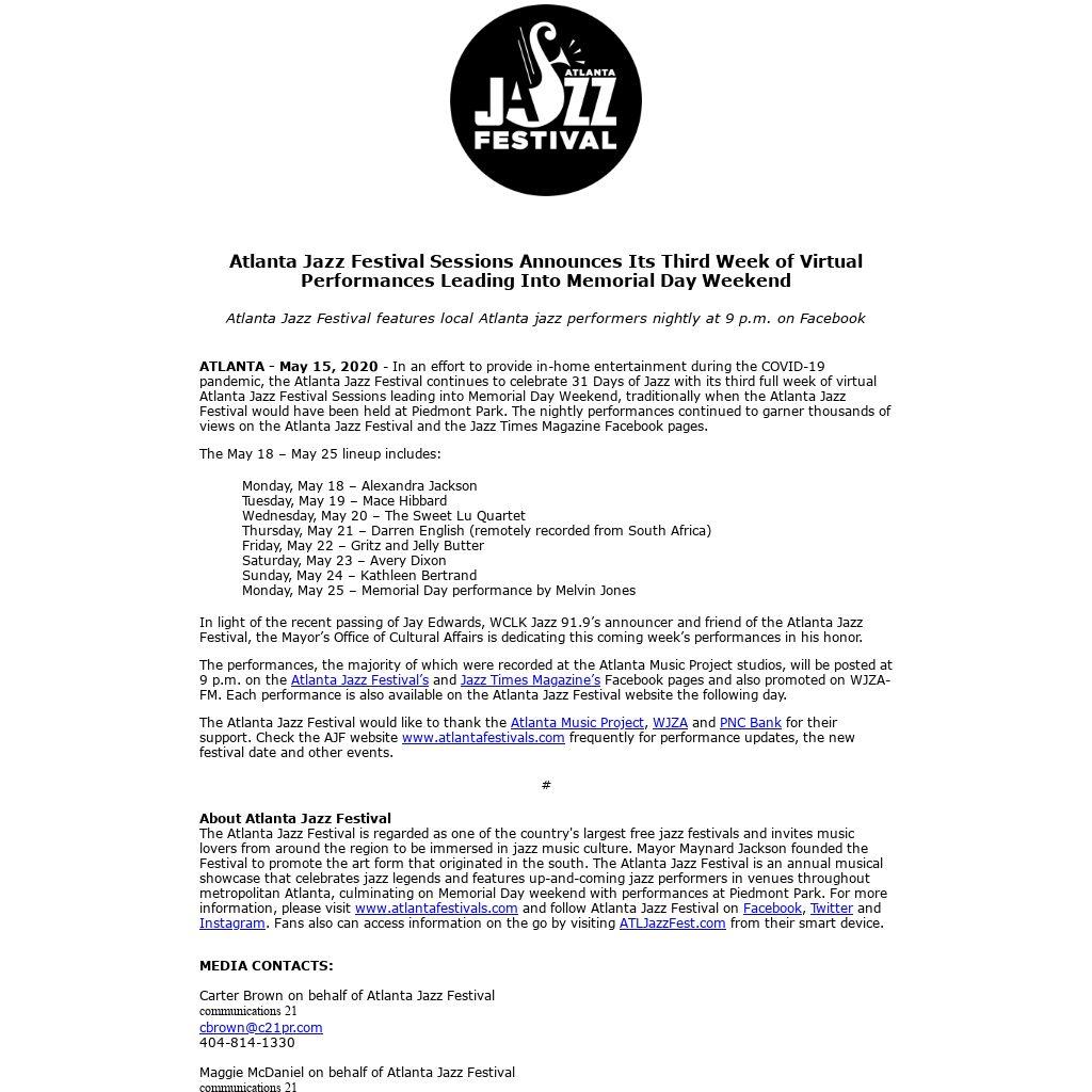 The Atlanta Jazz Festival would like to thank the Atlanta Music Project, WJZA and PNC Bank for their support. Check the AJF website www.atlantafestivals.com frequently for performance updates, the new festival date and other events.