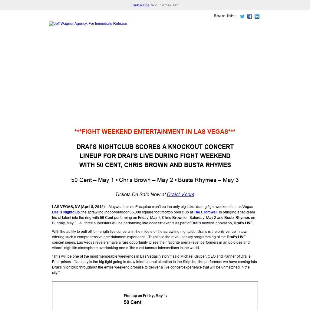 LAS VEGAS, NV (April 8, 2015) – Mayweather vs. Pacquiao won’t be the only big ticket during fight weekend in Las Vegas. Drai’s Nightclub, the sprawling indoor/outdoor 65,000 square foot rooftop pool club at The Cromwell, is bringing a tag-team trio of talent into the ring with 50 Cent performing on Friday, May 1, Chris Brown on Saturday, May 2 and Busta Rhymes on Sunday, May 3. All three superstars will be performing live concert events as part of Drai’s newest innovation, Drai’s LIVE. With the ability to pull off full-length live concerts in the middle of the sprawling nightclub, Drai’s is the only venue in town offering such a comprehensive entertainment experience. Thanks to the revolutionary programming of the Drai’s LIVE concert series, Las Vegas revelers have a rare opportunity to see their favorite arena-level performers in an up-close and vibrant nightlife atmosphere overlooking one of the most famous intersections in the world. “This will be one of the most memorable weekends in Las Vegas history,” said Michael Gruber, CEO and Partner of Drai’s Enterprises. “Not only is the big fight going to draw international attention to the Strip, but the performers we have coming into Drai’s Nightclub throughout the entire weekend promise to deliver a live concert experience that will be unmatched in the city.”
