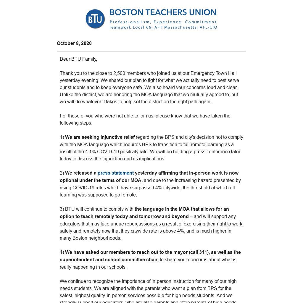 1) We are seeking injunctive relief regarding the BPS and city's decision not to comply with the MOA language which requires BPS to transition to full remote learning as a result of the 4.1% COVID-19 positivity rate. We will be holding a press conference later today to discuss the injunction and its implications.