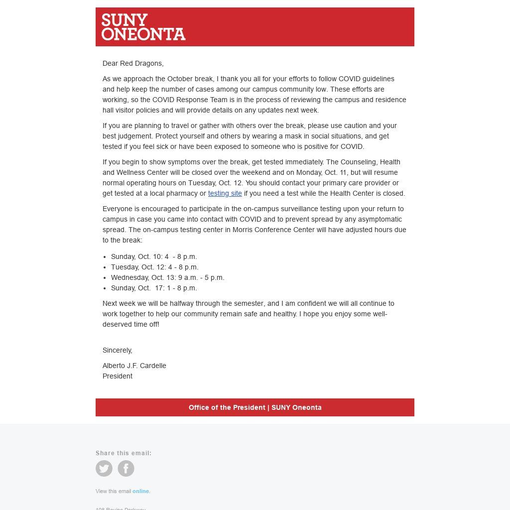 As we approach the October break, I thank you all for your efforts to follow COVID guidelines and help keep the number of cases among our campus community low. These efforts are working, so the COVID Response Team is in the process of reviewing the campus and residence hall visitor policies and will provide details on any updates next week.
