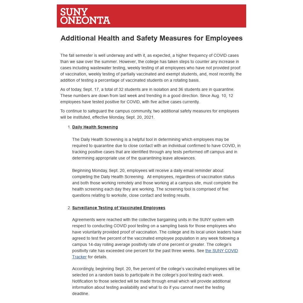 Thank you for making health and wellness a priority and complying with the college’s various safety requirements and protocols. The Office of Human Resources is available to answer questions and assist with any concerns you may have at 607-436-2518 or human.resources@oneonta.edu.
