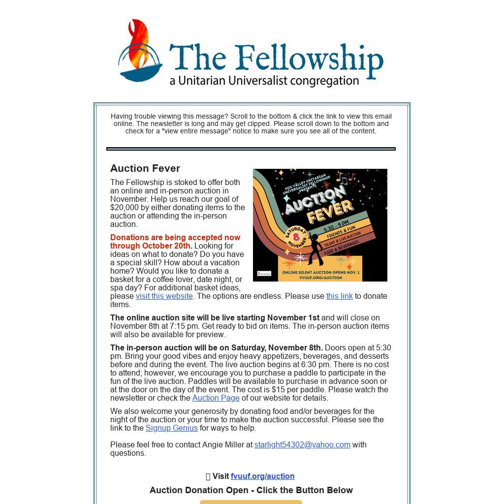 The Fellowship is stoked to offer both an online and in-person auction in November. Help us reach our goal of $20,000 by either donating items to the auction or attending the in-person auction.