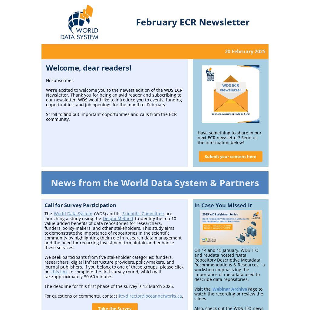 We’re excited to welcome you to the newest edition of the WDS ECR Newsletter. Thank you for being an avid reader and subscribing to our newsletter. WDS would like to introduce you to events, funding opportunities, and job openings for the month of February.