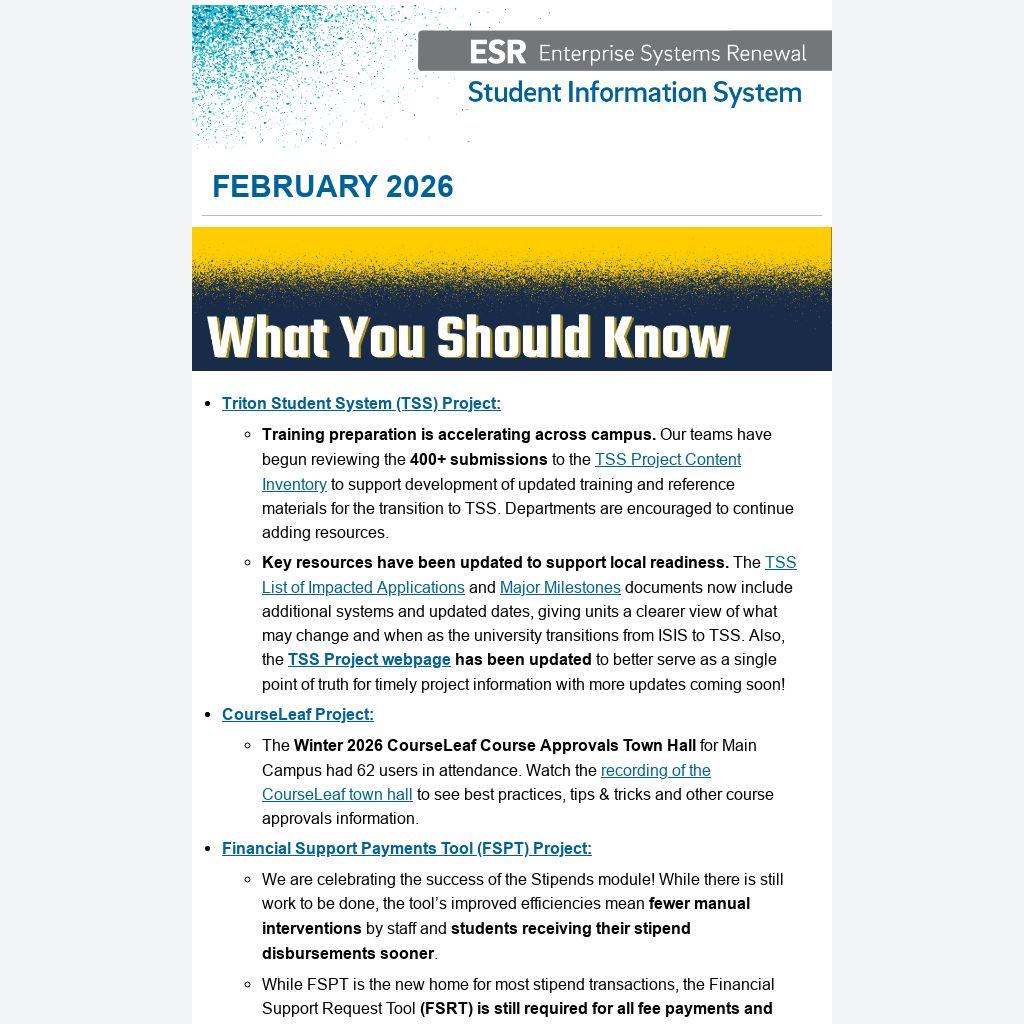 Key resources have been updated to support local readiness. The TSS List of Impacted Applications and Major Milestones documents now include additional systems and updated dates, giving units a clearer view of what may change and when as the university transitions from ISIS to TSS. Also, the TSS Project webpage has been updated to better serve as a single point of truth for timely project information with more updates coming soon!