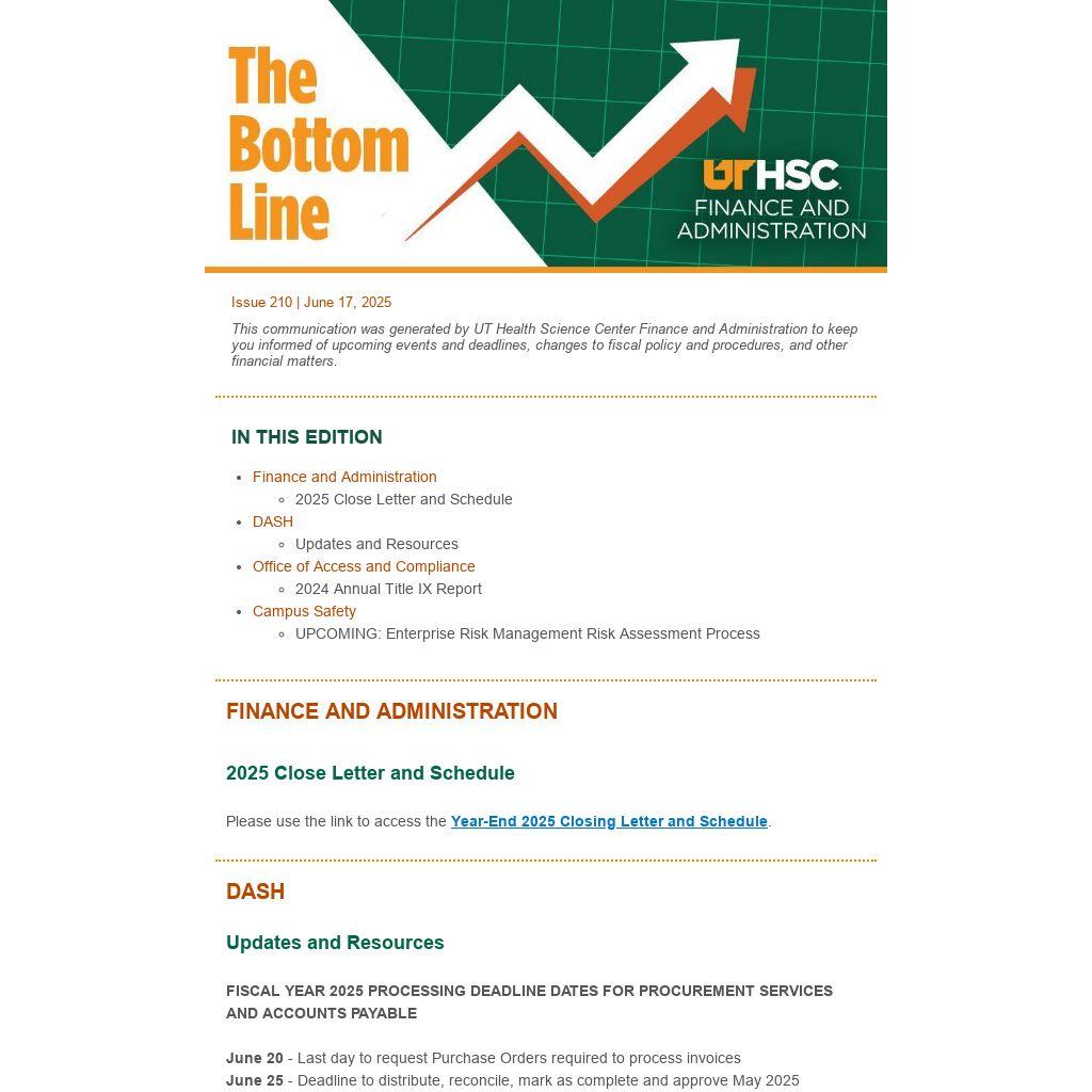 This communication was generated by UT Health Science Center Finance and Administration to keep you informed of upcoming events and deadlines, changes to fiscal policy and procedures, and other financial matters.