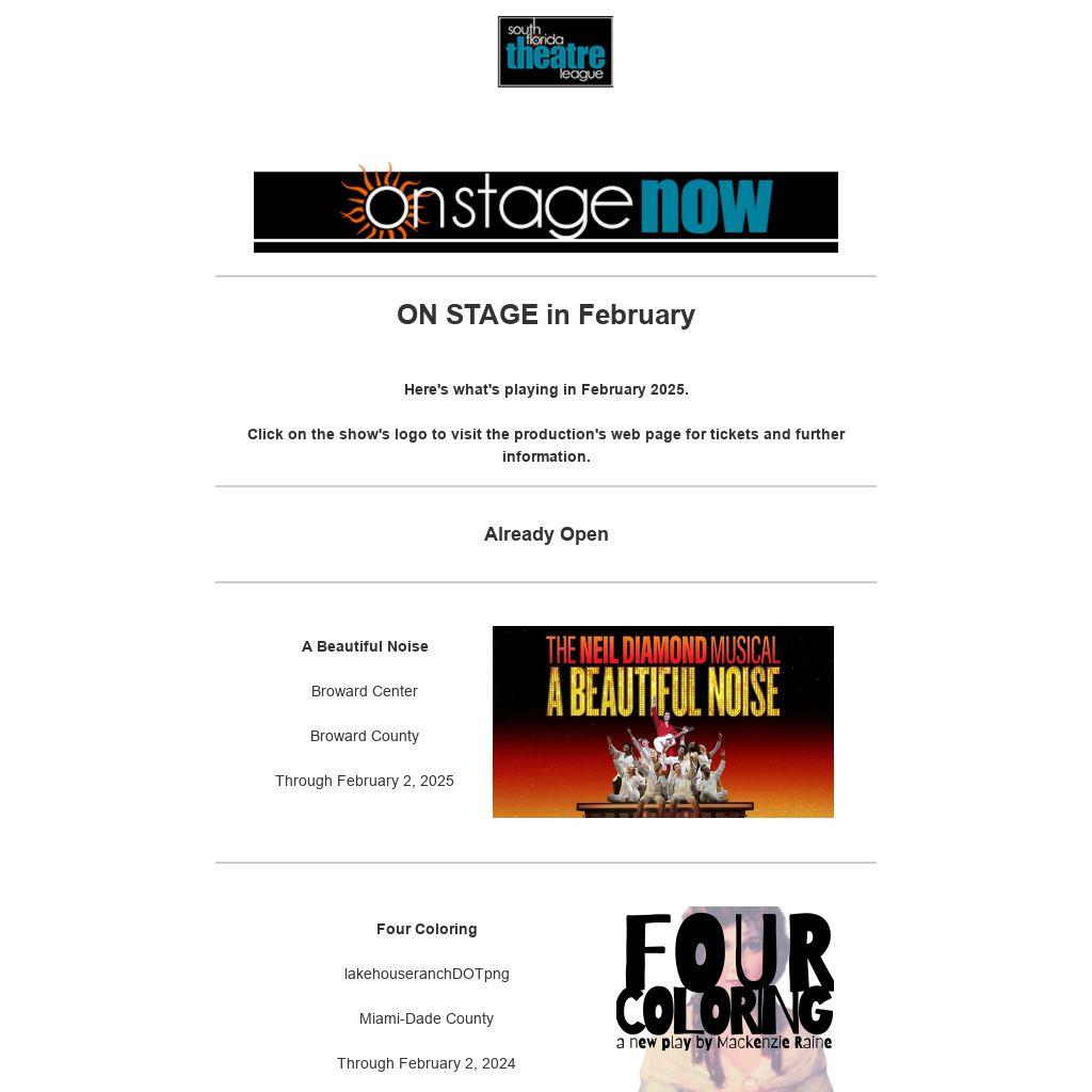 Here's what's playing in February 2025. Click on the show's logo to visit the production's web page for tickets and further information.