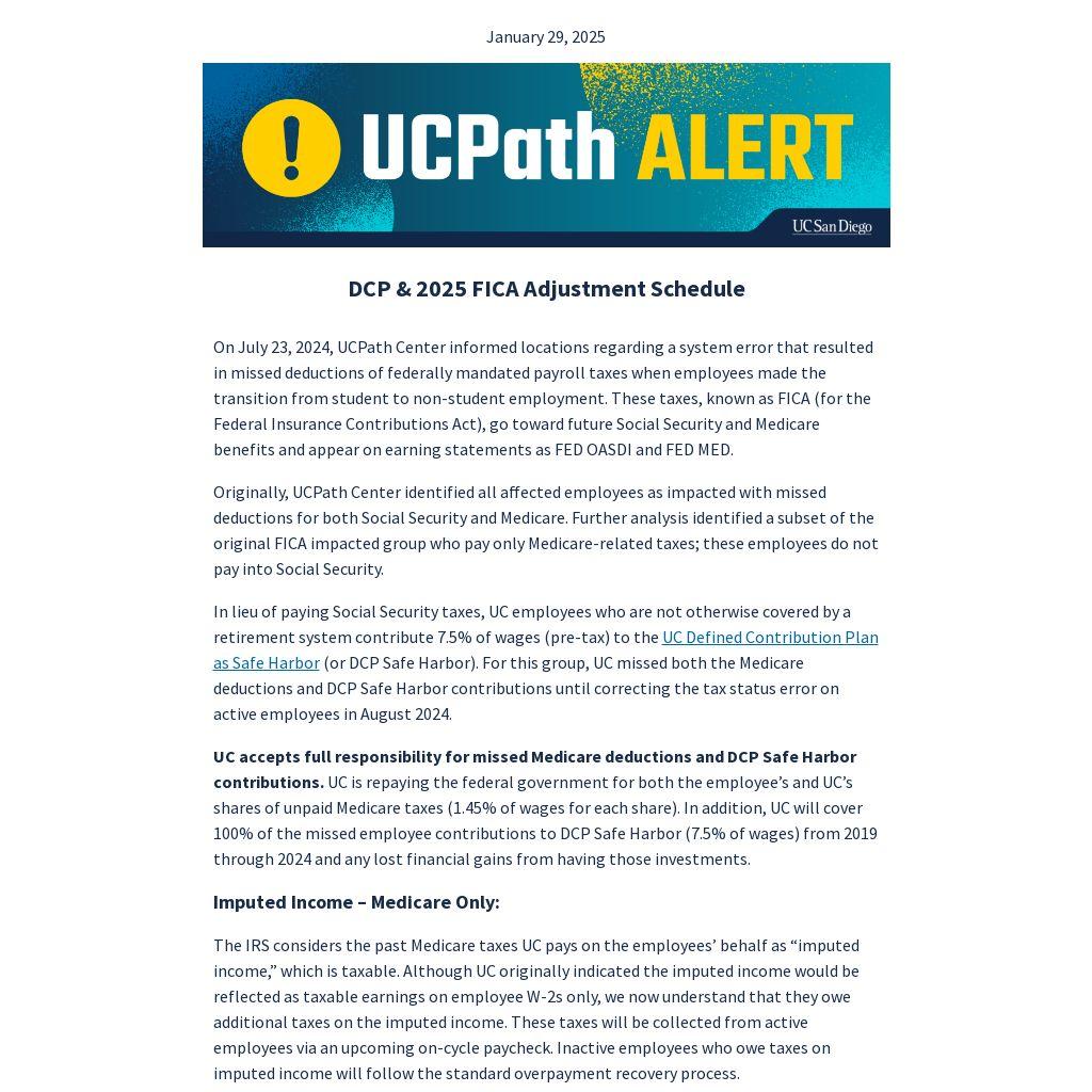 On July 23, 2024, UCPath Center informed locations regarding a system error that resulted in missed deductions of federally mandated payroll taxes when employees made the transition from student to non-student employment. These taxes, known as FICA (for the Federal Insurance Contributions Act), go toward future Social Security and Medicare benefits and appear on earning statements as FED OASDI and FED MED.