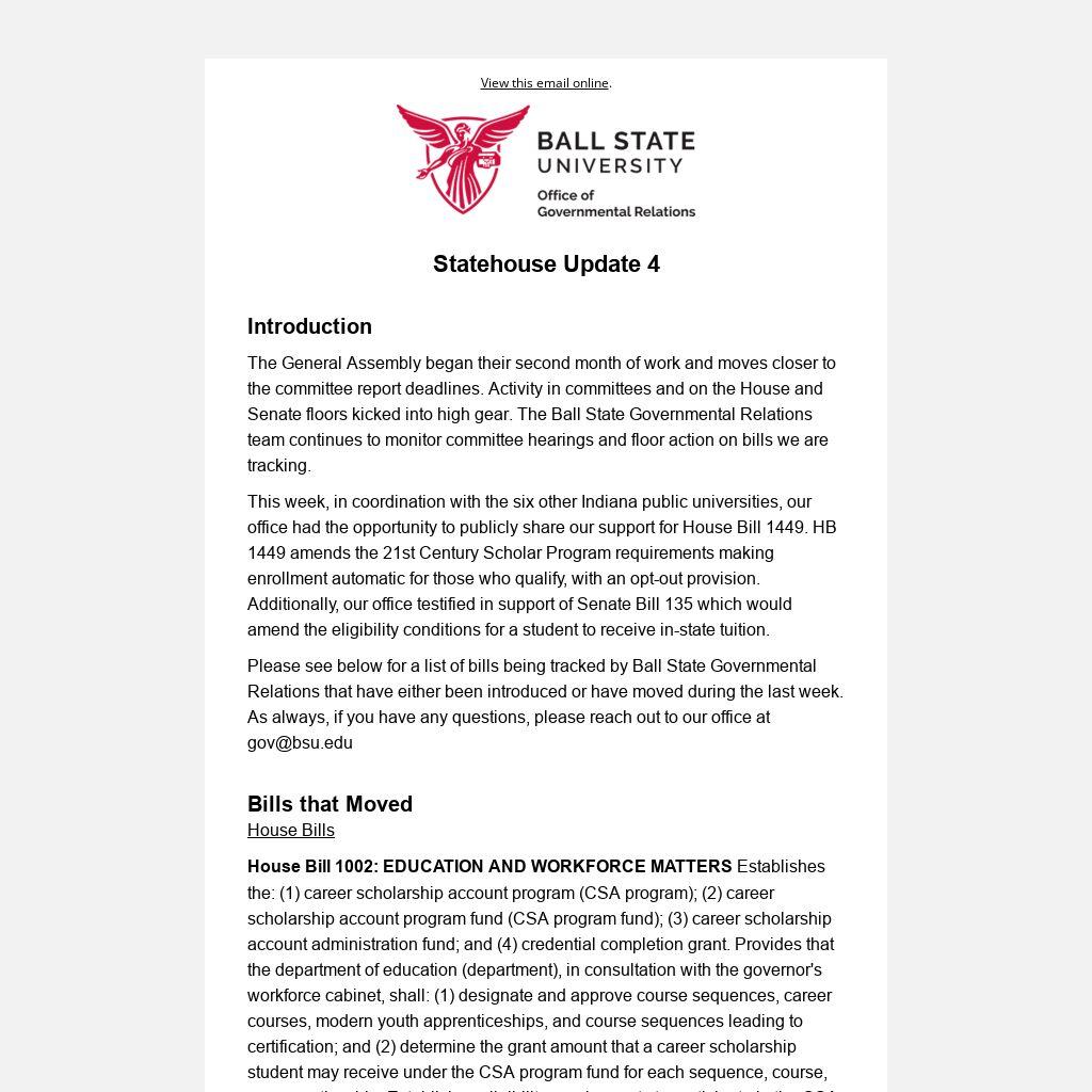 Please see below for a list of bills being tracked by Ball State Governmental Relations that have either been introduced or have moved during the last week. As always, if you have any questions, please reach out to our office at gov@bsu.edu