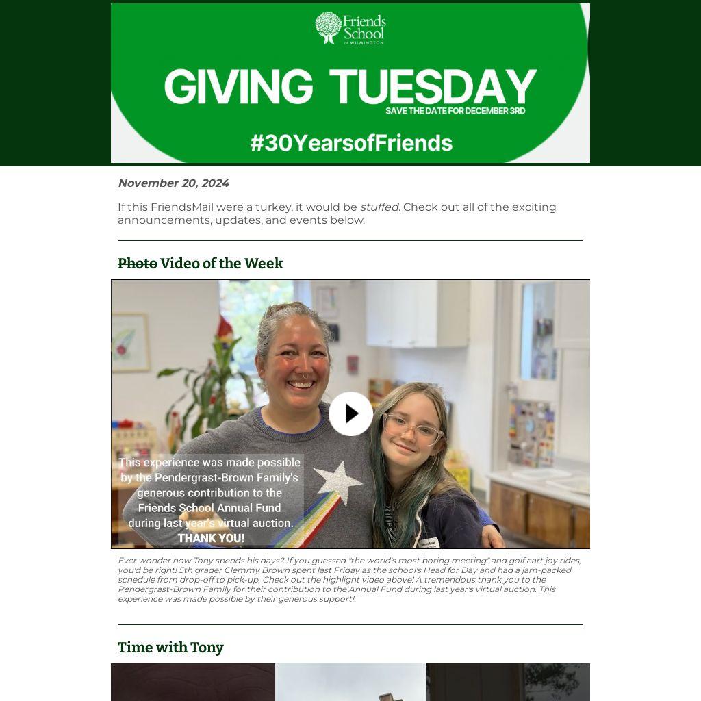Friends, we're less than 2 weeks away from one of our school's most important fundraising events of the year—Giving Tuesday! This year, on our 30th anniversary, we'll be celebrating all the things that make us so uniquely *Friends.* 100% of your donations go to support our Annual Fund, which helps cover the difference between tuition and operating expenses. We've raised $20,000 in years' past. Can we celebrate our 30 year milestone with $30,000? Let's do it, together!