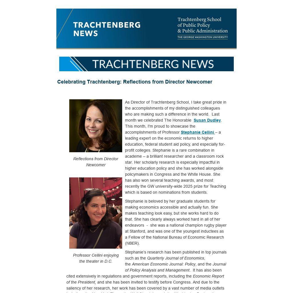 As Director of Trachtenberg School, I take great pride in the accomplishments of my distinguished colleagues who are making such a difference in the world. Last month we celebrated The Honorable Susan Dudley. This month, I'm proud to showcase the accomplishments of Professor Stephanie Cellini – a leading expert on the economic returns to higher education, federal student aid policy, and especially for-profit colleges. Stephanie is a rare combination in academe – a brilliant researcher and a classroom rock star. Her scholarly research is especially impactful in higher education policy and she has worked alongside policymakers in Congress and the White House. She has also won several teaching awards, and most recently the GW university-wide 2025 prize for Teaching which is based on nominations from students.