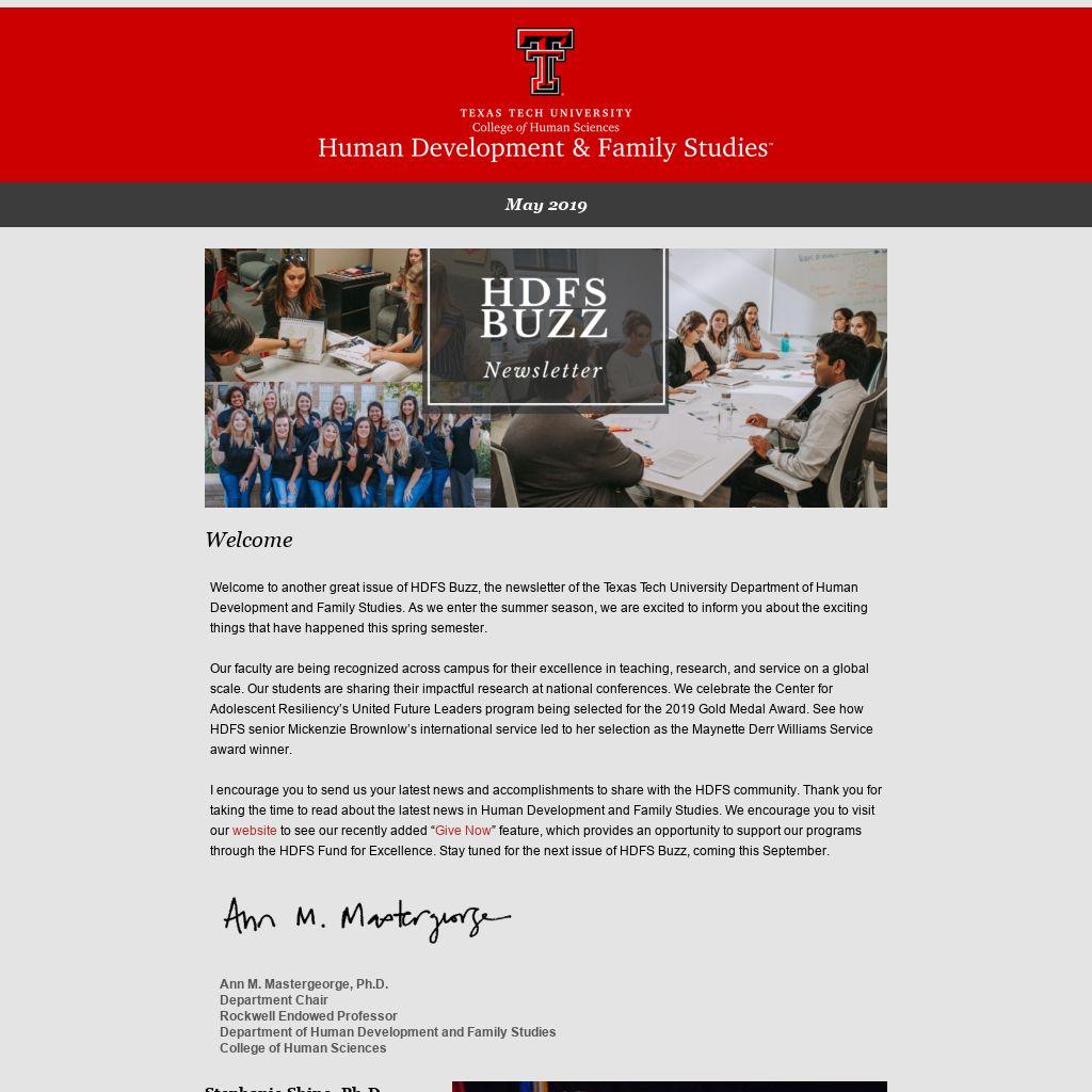 Welcome to another great issue of HDFS Buzz, the newsletter of the Texas Tech University Department of Human Development and Family Studies. As we enter the summer season, we are excited to inform you about the exciting things that have happened this spring semester.